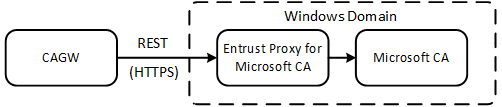 In this architecture, CA Gateway is a client of Microsoft CA. See in the following sections how to configure the Entrust Proxy for Microsoft CA and CA Gateway to manage Microsoft CAs.