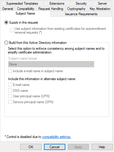 - In the Subject Name tab, enable the Supply in the request radio button.