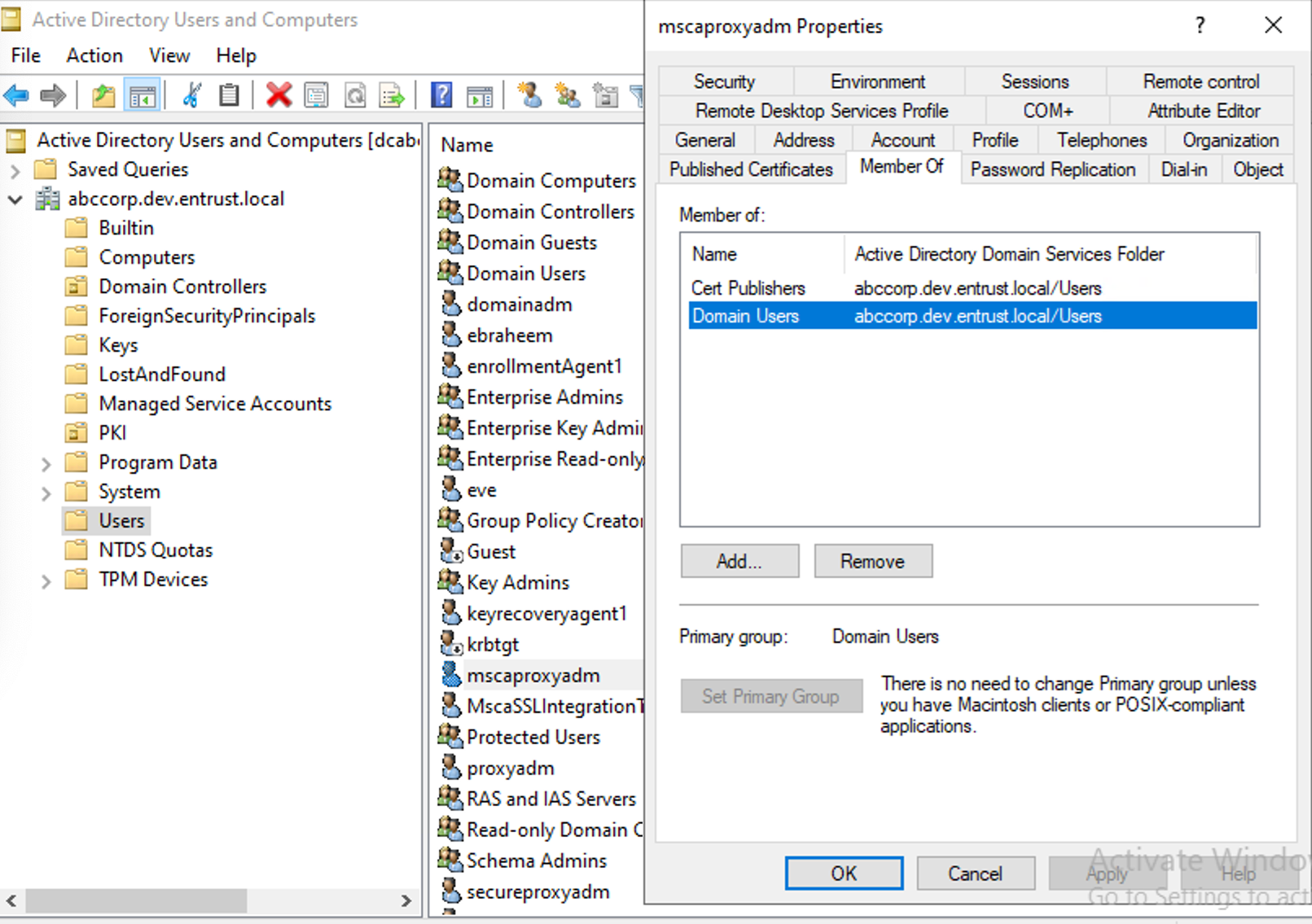 Create a Proxy Admin user and add it only to the Cert Publishers and Domain User groups.
