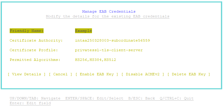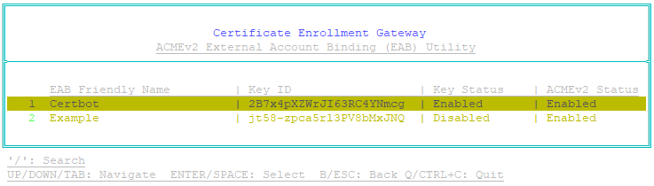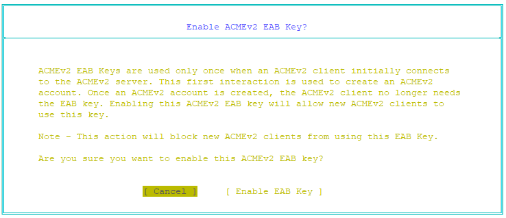 You can enable a key that has been disabled for an External Account Binding credential. When you enable a key, new ACMEv2 clients can use the key to create a new ACMEv2 account.