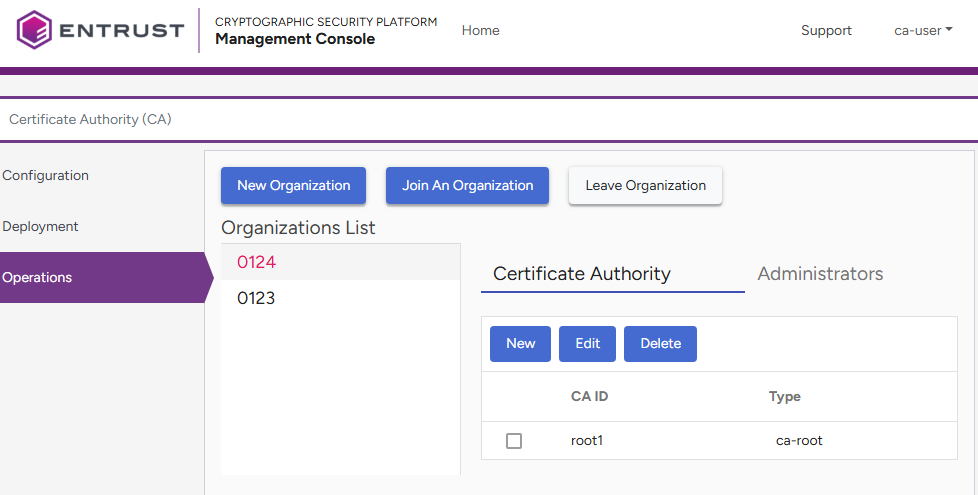 <machine>is the IP address or domain name of the machine hosting Cryptographic Security Platform.- Log in to the Management Console as one of the users created in Creating Certificate Authority tenants.