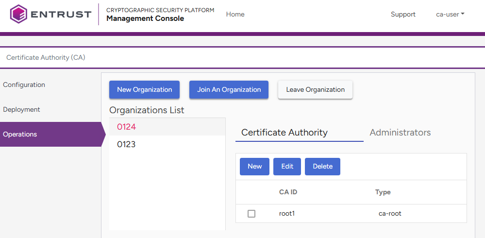 <machine>is the IP address or domain name of the machine hosting Cryptographic Security Platform.- Log in to the Management Console as one of the users created in Creating Certificate Authority tenants. This user will be the tenant of the new root Certificate Authority.