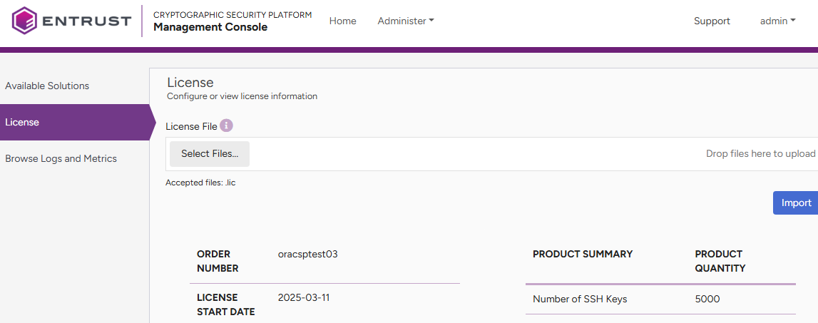 The Cryptographic Security Platform license determines the Entrust solutions you are allowed to run on Cryptographic Security Platform. See below for how to set or update this license using the Management Console.