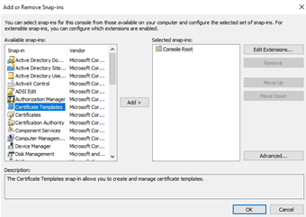 To add Certificate Templates using the Windows graphical interface, complete the following procedure.