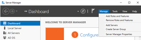 The Server Manager dialog box appears. - Select Manage > Add Roles and Features.