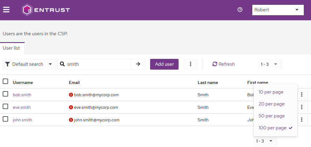 - Use the search options to filter users and select the number of users per page.