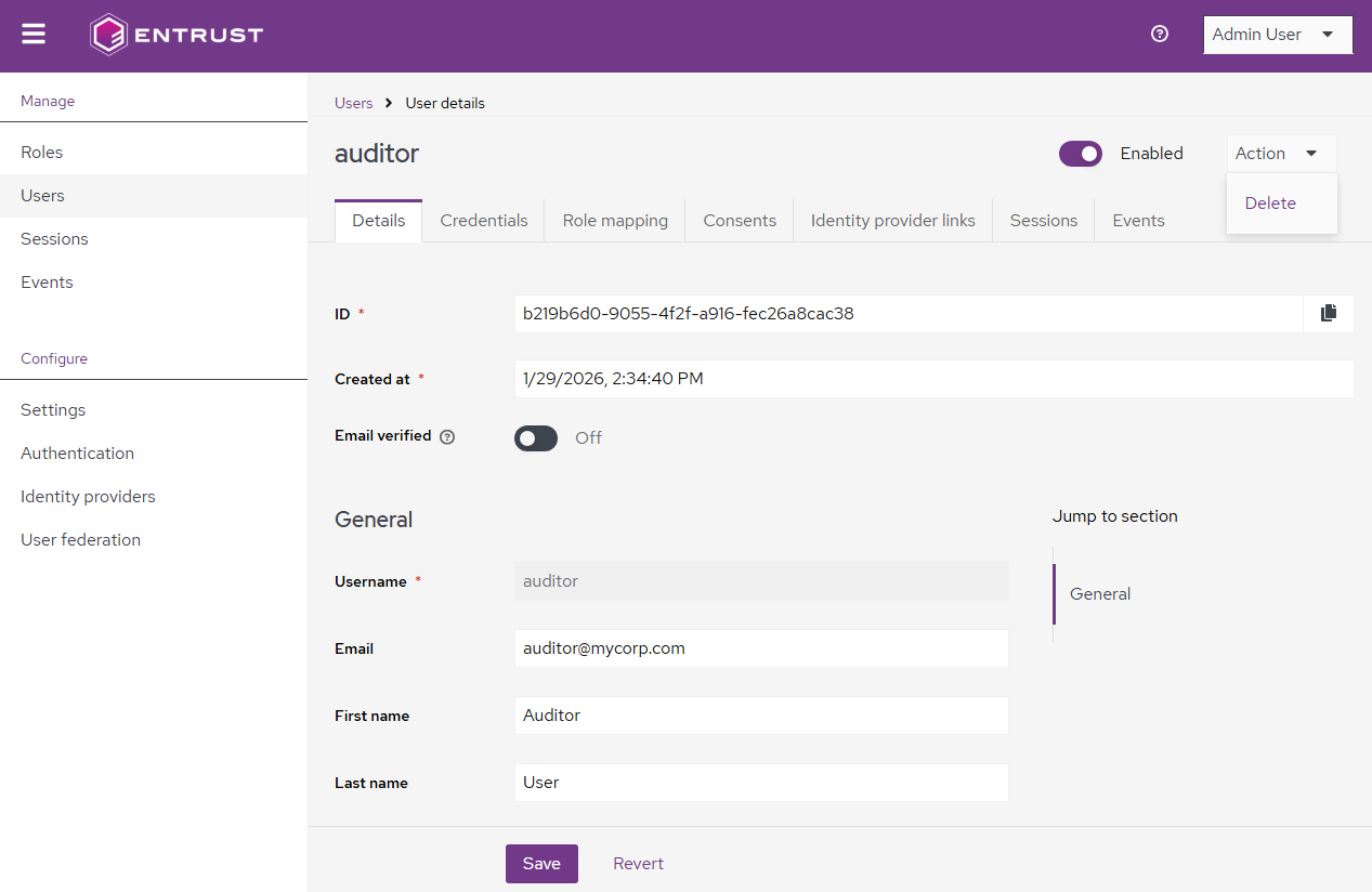 - Log in to the Management Console as a user with a role granting user management permissions – for example, the initial