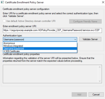 12. In the Enter enrollment policy server URI field, enter the URL of the Certificate Enrollment Policy Web Service that you obtained earlier in Configuring Windows Domain Endpoints.