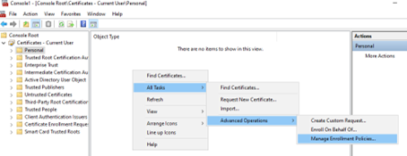 10. Right-click Personal > All Tasks > Advanced Operations > Manage Enrollment Policies.