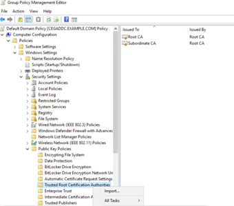 5. In the tree view, expand Computer Configuration > Policies > Windows Settings > Security Settings > Public Key Policies > Trusted Root Certification Authorities.