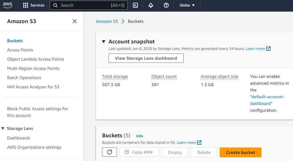- Select S3 in the search results to display the Amazon S3 > Buckets page.