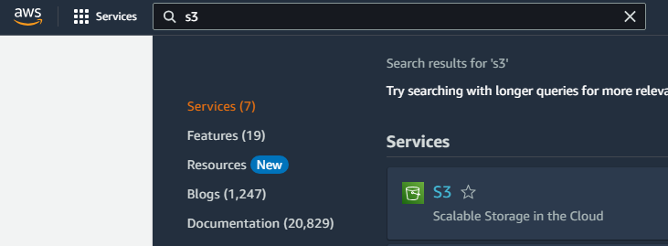 - Type "S3" in the search box of the AWS console.