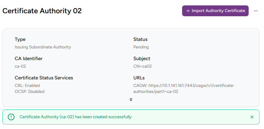 - Click Create to create the new Certificate Authority.