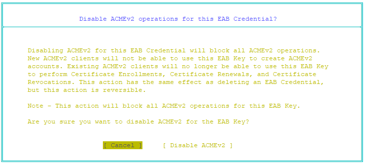 You can disable ACMEv2 operations for an External Account Binding credential. Disabling ACMEv2 operations for an External Account Binding credential will disable the credential. When you disable ACMEv2 operations for an External Account Binding credential, new ACMEv2 clients cannot use the credential to create an account, and ACMEv2 clients with an existing account cannot perform any ACMEv2 operations with the credential.