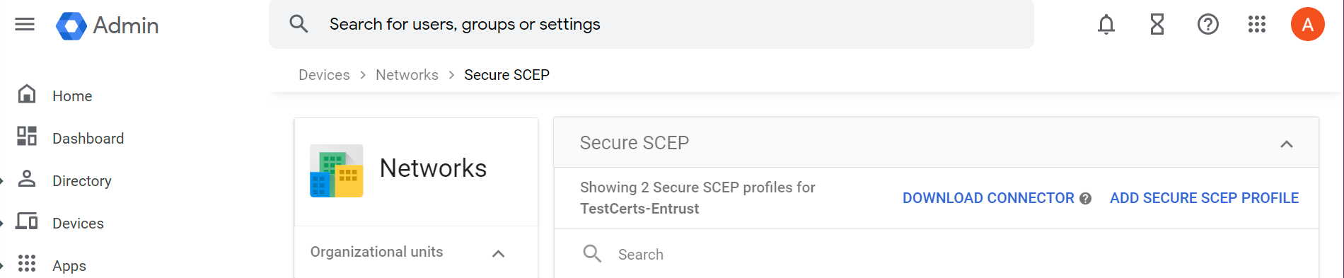 - Navigate to Google Admin > Devices > Networks > Secure SCEP. The Secure SCEP page appears.