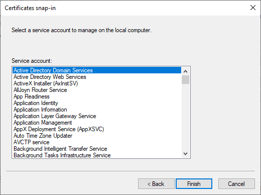 The Certificates snap-in dialog box appears. - Select Service account.