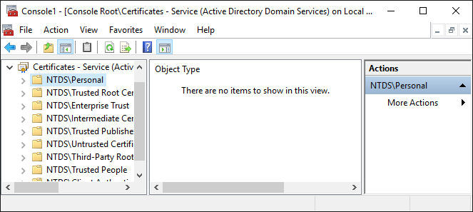The Certificates snap-in appears in the Microsoft Management Console. - In the tree view, select Certificates > NTDS\Personal.