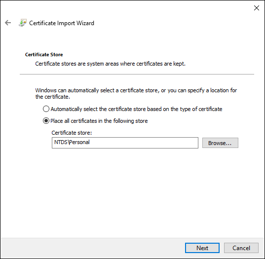 The Certificate Store page appears. - The NTDS\Personal certificate store is already selected. Click Next.