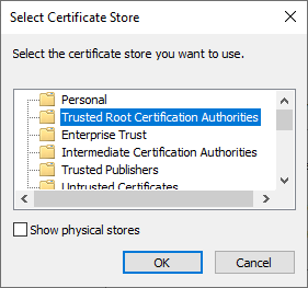The Select Certificate Store dialog box appears. - If the CA certificate is a root CA certificate, select Trusted Root Certification Authorities.