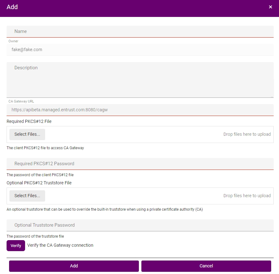 - On the CA Gateways page, click Add.