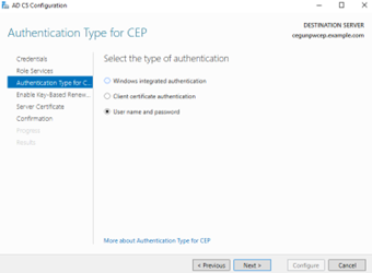 The Authentication Type for CEP page appears.