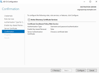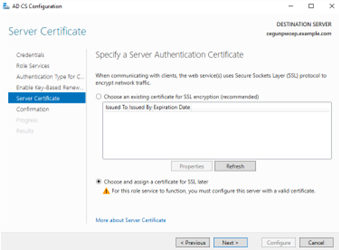 The Certificate Enrollment Policy Web Service requires a TLS certificate in Microsoft IIS. You will set the TLS certificate later, as explained in Configuring the TLS certificate of the Windows endpoints.