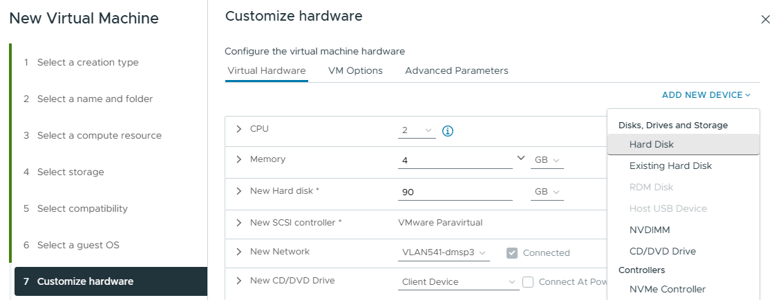 - Click ADD NEW DEVICE and select Hard disk to add the additional disk.